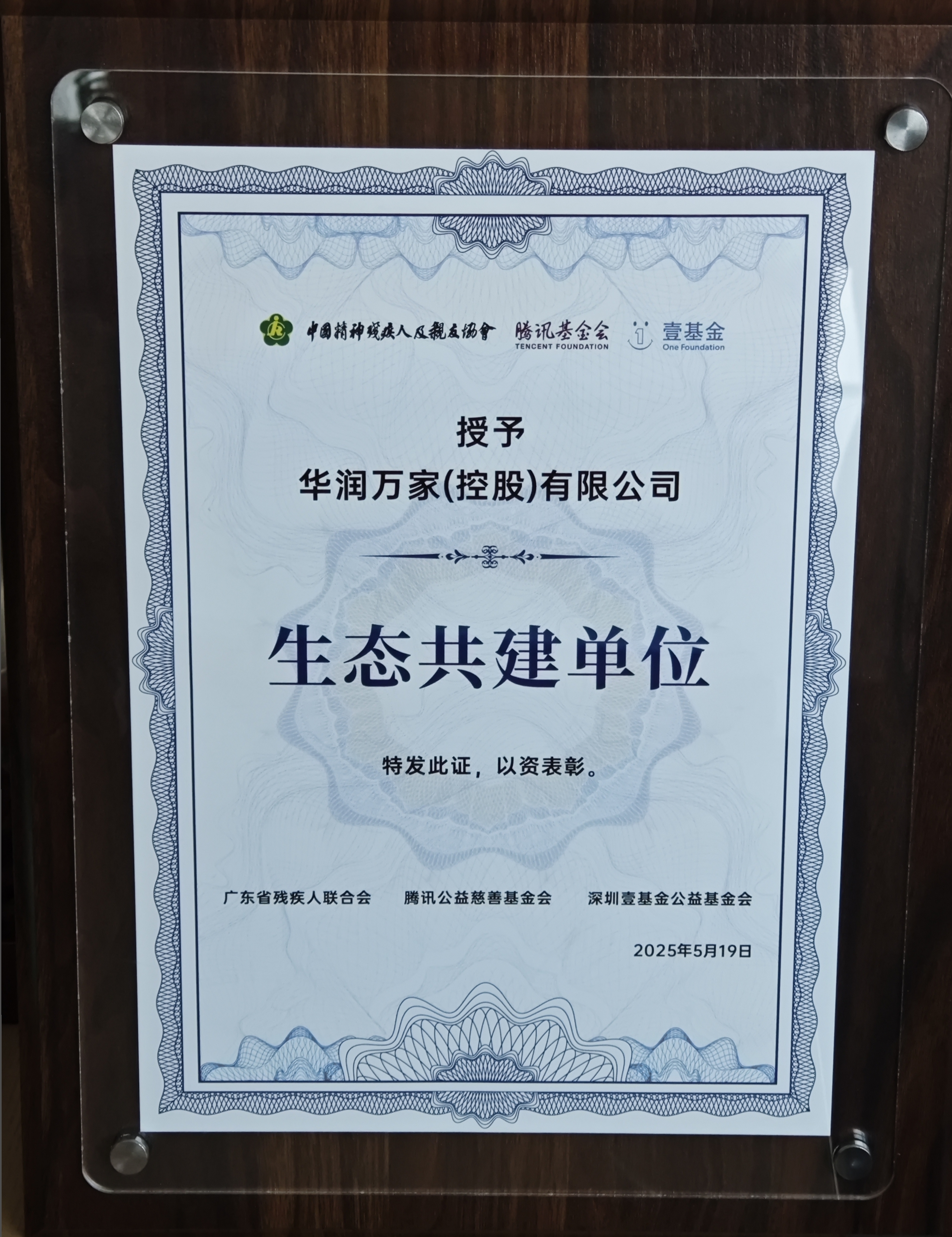 近日,由广东省残疾人联合会、深圳市残疾人联合会、深圳壹基金公益基金会等单位联合主办“共建数字助力孤独症家庭社区支持新生态行业交流会”活动,华润万家华南大区荣获“生态共建单位”的称号。