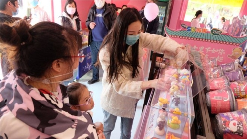 步入樱花节主会场,映入眼帘的是粉蓝相间的苏果“好的”春风客栈,无论是黄色的灯笼、红色的立柱、蓝色的屋檐,还是身着汉服演奏古筝、琵琶的工作人员,都仿佛让人置身于武侠小说的场景,不少游客在客栈外拍照、直播。作为一家主题便利店,客栈内部以粉色为基调,装饰以樱花元素,与樱花节主题呼应,货架排列整齐、商品种类丰富,犹如江湖侠客进店之后,“一笑千里尽长歌,三餐四季在此间”。