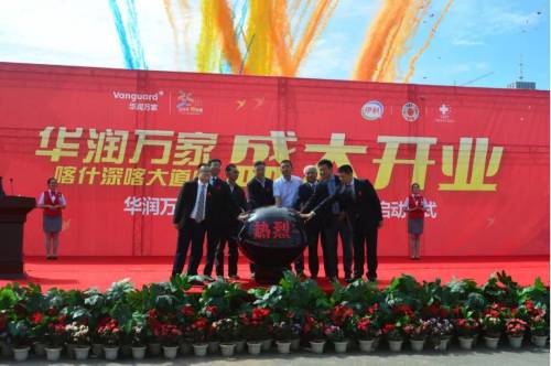 6月19日上午,新疆喀什市东部新城,在威风锣鼓的助威声、欢快的维吾尔民族歌舞以及震耳欲聋的鞭炮声中,喀什民众翘首期盼的华润万家喀什店盛大开业。新疆维吾尔自治区商务厅党组成员、副厅长丁书旺、华润集团有限公司助理总经理李福祚、华润万家有限公司总经理徐辉、喀什地委委员、常务副专员武洪斌、喀什市委常委、副市长武卫国、深业置地有限公司副总经理胡月明、深圳市对口支援新疆工作前方指挥部总指挥杨春生及广东、上海、山东援疆前方指挥部负责人等出席开业仪式。