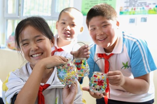 在支教老师的指导下,一个个别出心裁的“艺术品”在孩子们的手中诞生。绿色是广袤无垠的巴音布鲁克大草原,白色是逶迤连绵的博格达峰雪山,蓝色是赛里木湖的碧波,紫色是伊犁的薰衣草,黄色是昭苏的油菜花……家乡新疆热烈的色彩,被画笔定格在了孩子们亲手制作的马赛克烛台上。这些色彩斑斓的烛台,作为礼物在“美好流动课堂”支教活动新疆站的启动仪式上惊艳亮相。